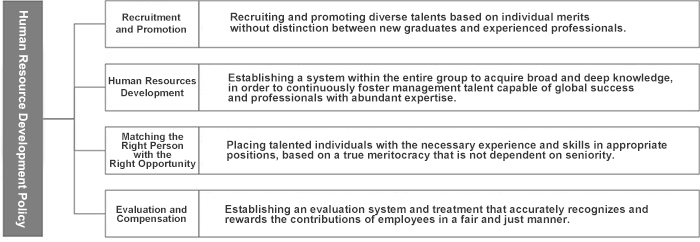 To realize our goal of enhancing corporate value under Management Plan 2030, we recognize the need to proactively invest in human capital who are closely aligned with our business strategies. We will continue to strengthen our recruitment and development efforts, and our other human capital initiatives. We also aim to fully harness the diverse values and experiences of our employees by providing career opportunities that enable each individual to demonstrate their individuality and let their own flowers bloom. By cultivating a supportive workplace environment, we will come together as one team to further enhance our corporate value.